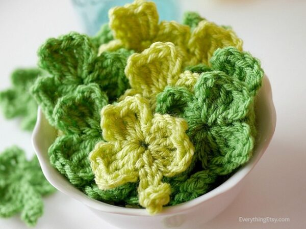 Because these shamrocks are so small, this is a great chance to use up some of your smaller yarn scraps. I know shamrocks are technically green, but I think it would be super cute to crochet a rainbow of shamrocks and turn them into a bunting.
