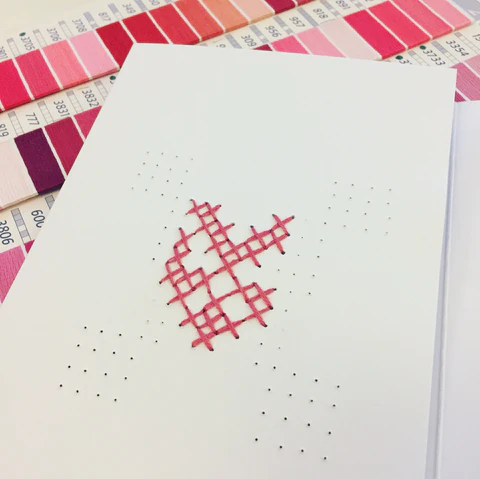Creating a template and pre-punching holes with an awl or sharp pin allows you to cross stitch directly onto cardstock. I think this is a lovely method for making greeting cards and bookmarks, in particular. To hide the back of the stitching, glue or blanket stitch another piece of cardstock in place.