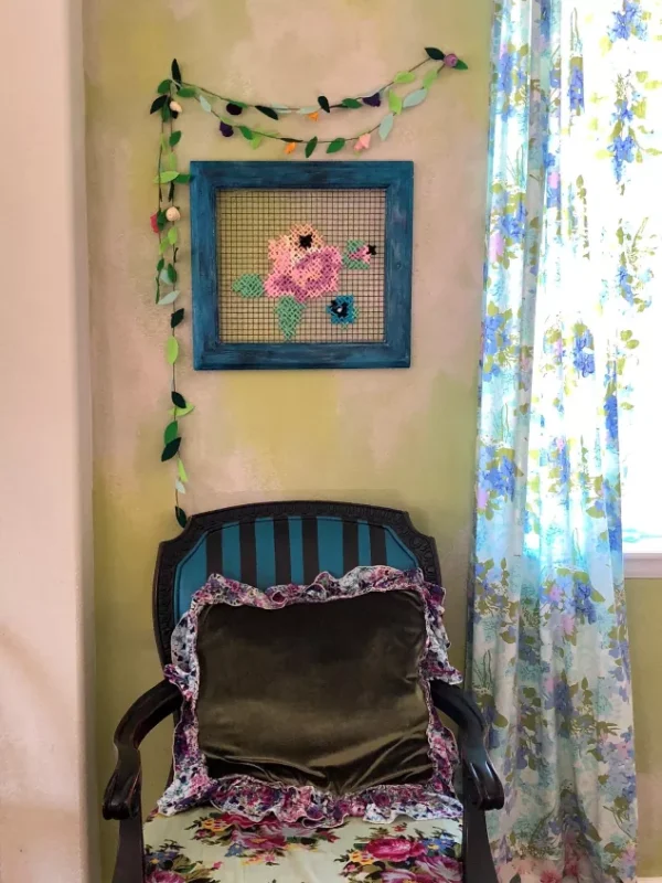 The cross stitching in this article is done on store-bought wooden blanks, which would not work to solve either my boycotting the economy issue or my having too much stuff issue, BUT if you’ve got some thin wood to experiment with, and a drill that you’re not afraid to wield, you could easily DIY these blanks. Alternatively, if you’ve got some pegboard going spare, cut it to size and cross stitch on it with chunky yarn.